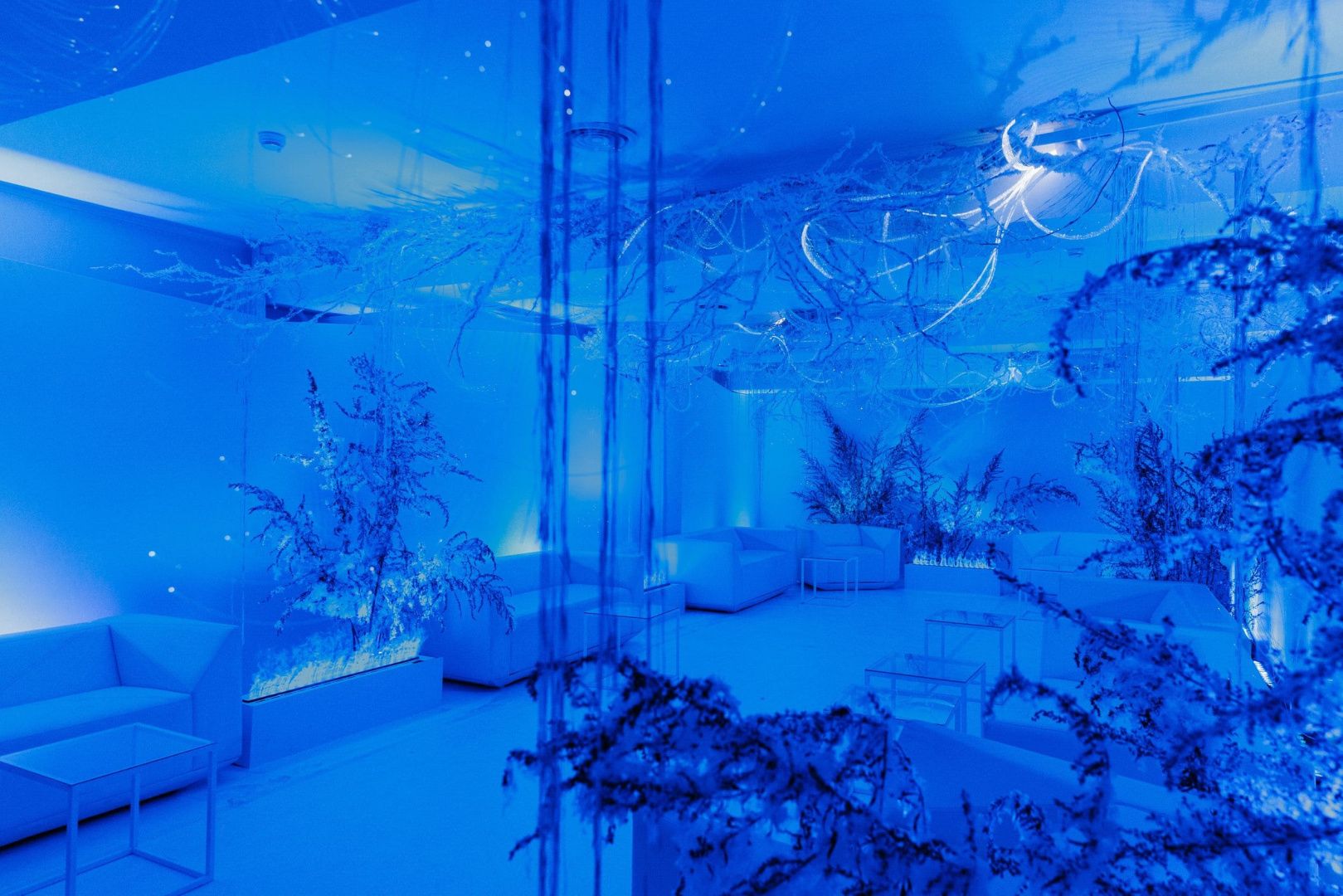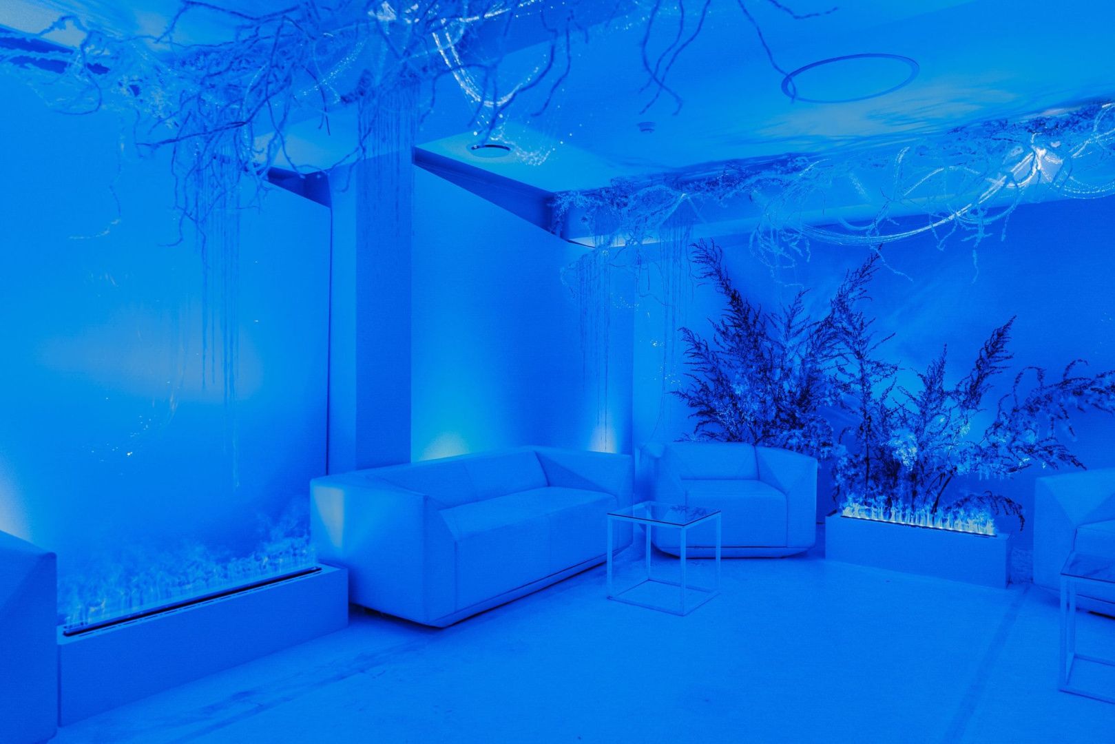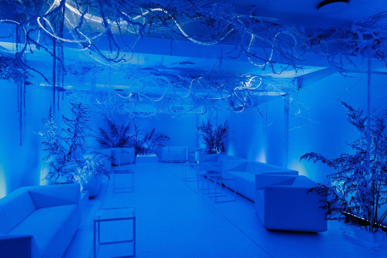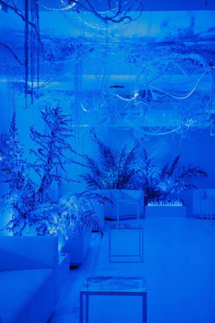 Для декорирования лаундж зоны мы использовали оптоволоконную нить бокового свечения с насечками. Благодаря удаленности источника света она безопасна: не нагревается и не проводит электричество, а композиция ее расположения может быть легко переоформлена даже перед началом ивента, позволяя импровизировать по настроению и ожиданиям заказчика.