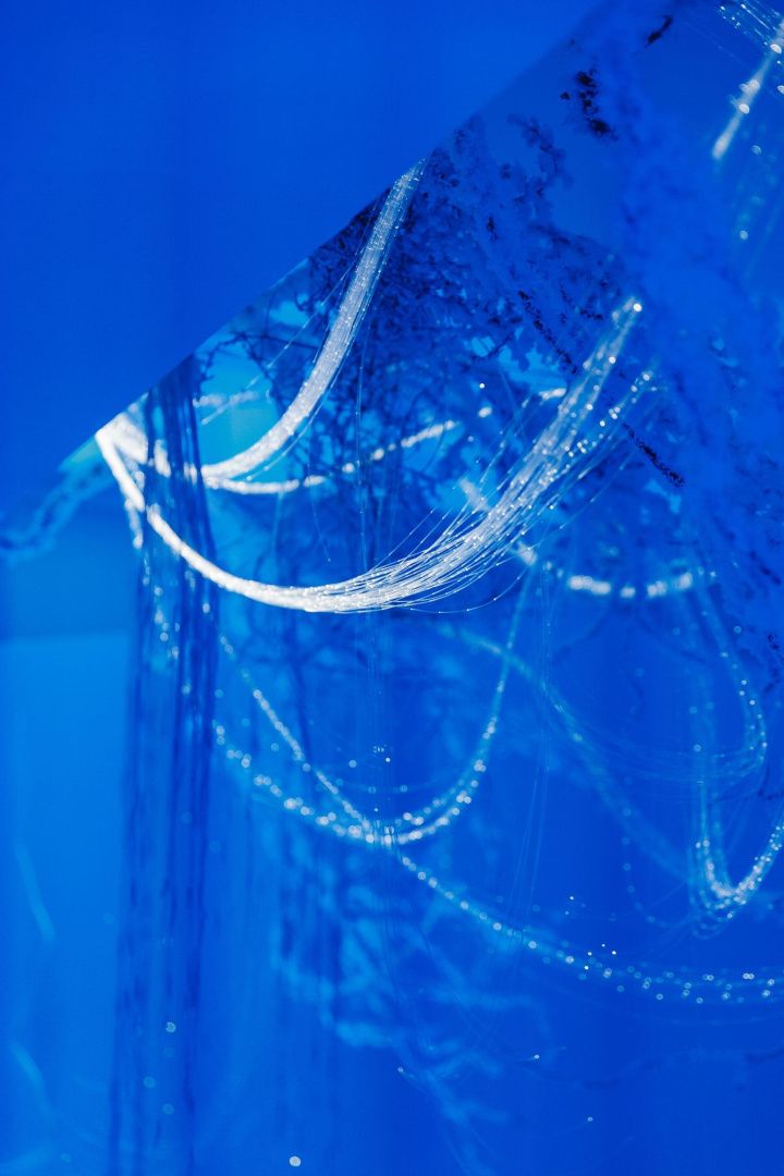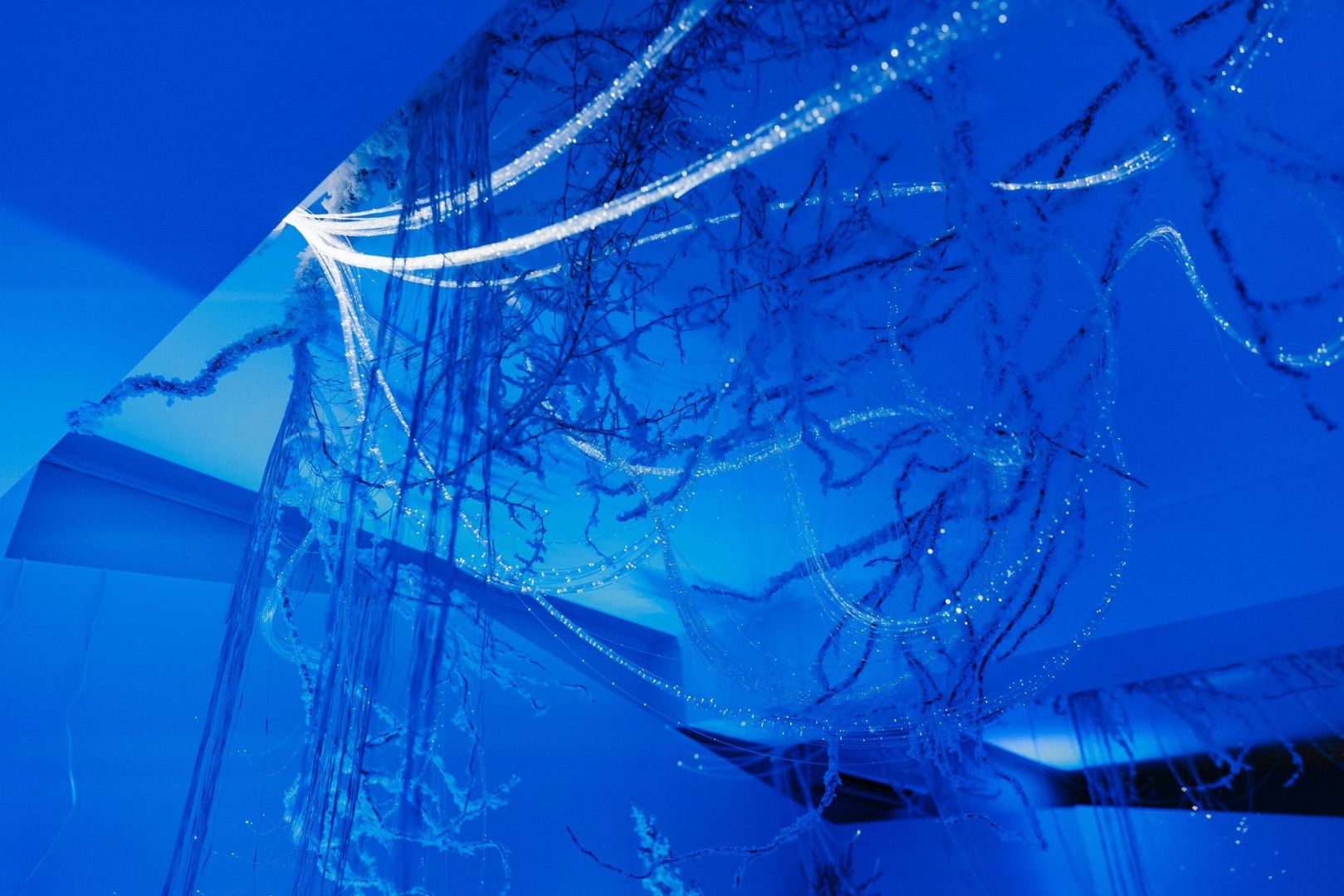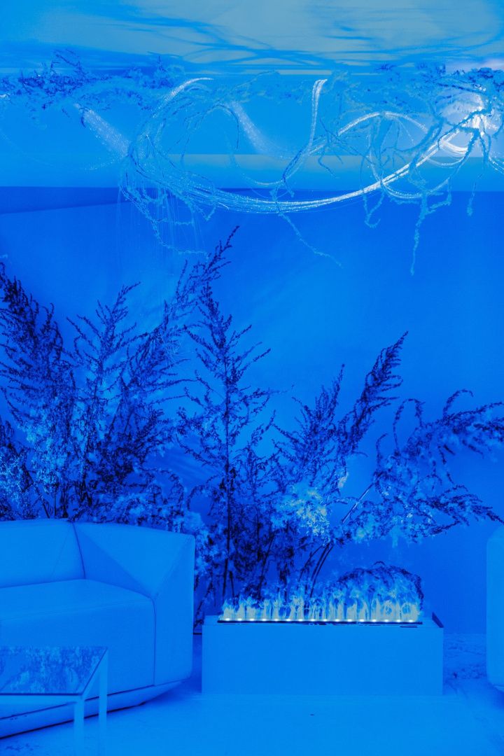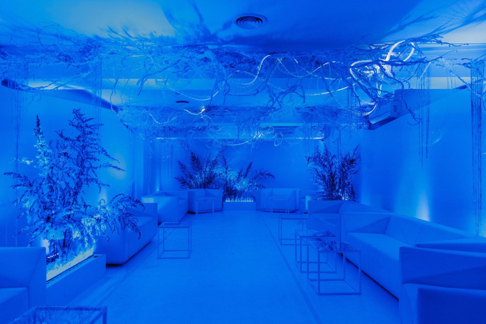Для декорирования лаундж зоны мы использовали оптоволоконную нить бокового свечения с насечками. Благодаря удаленности источника света она безопасна: не нагревается и не проводит электричество, а композиция ее расположения может быть легко переоформлена даже перед началом ивента, позволяя импровизировать по настроению и ожиданиям заказчика.