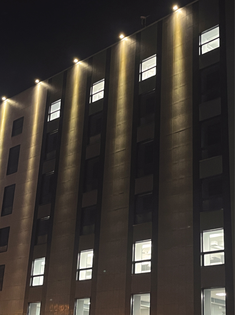 Задача фасадного освещения для объектов подобного класса должна быть сдержанной, чтобы соответствовать стилистике архитектуры, а также достаточно теплой и гостеприимной. Также организация архитектурной подсветки требует использования надежного пылевлагозащищённого профессионального оборудования.
