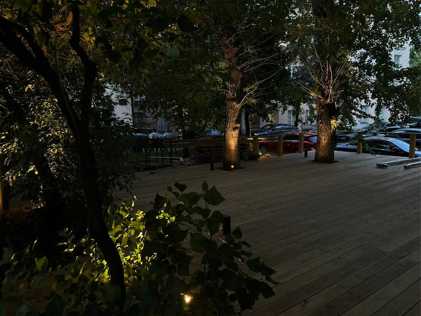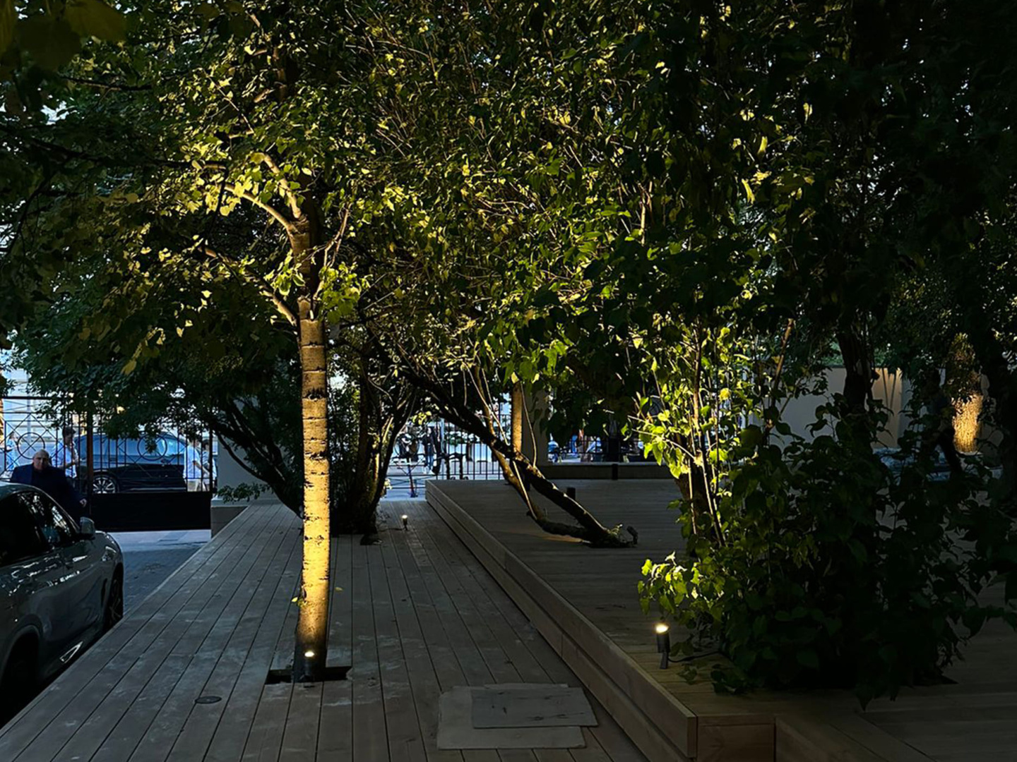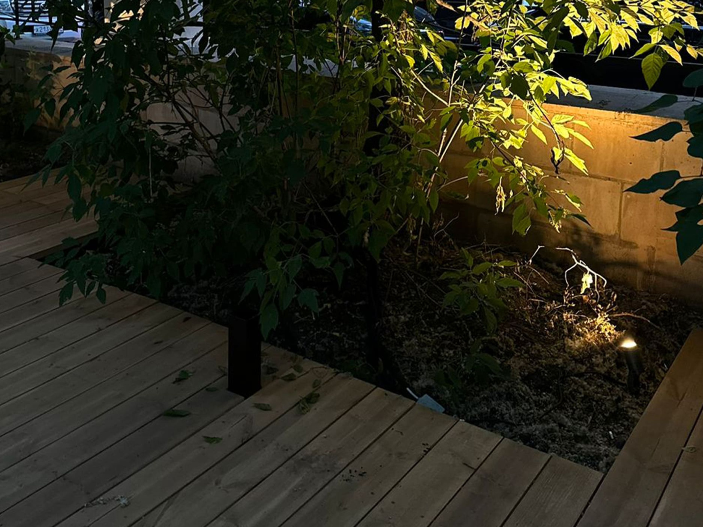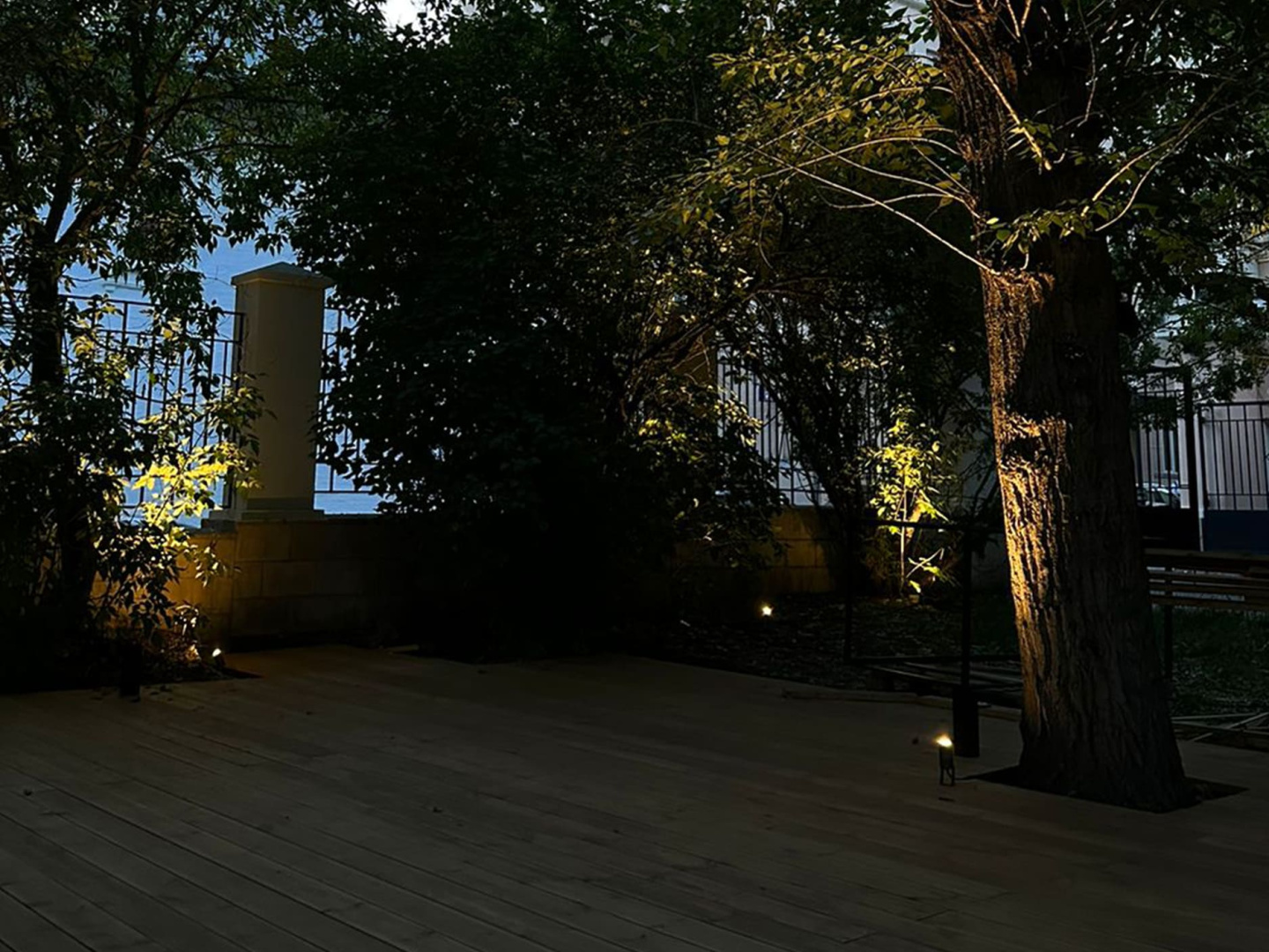 При помощи дополнительных аксессуаров (основания-пики или круглого основания) прожекторы установлены в грунт и на поверхность досок. Всего использовано 20 светильников.