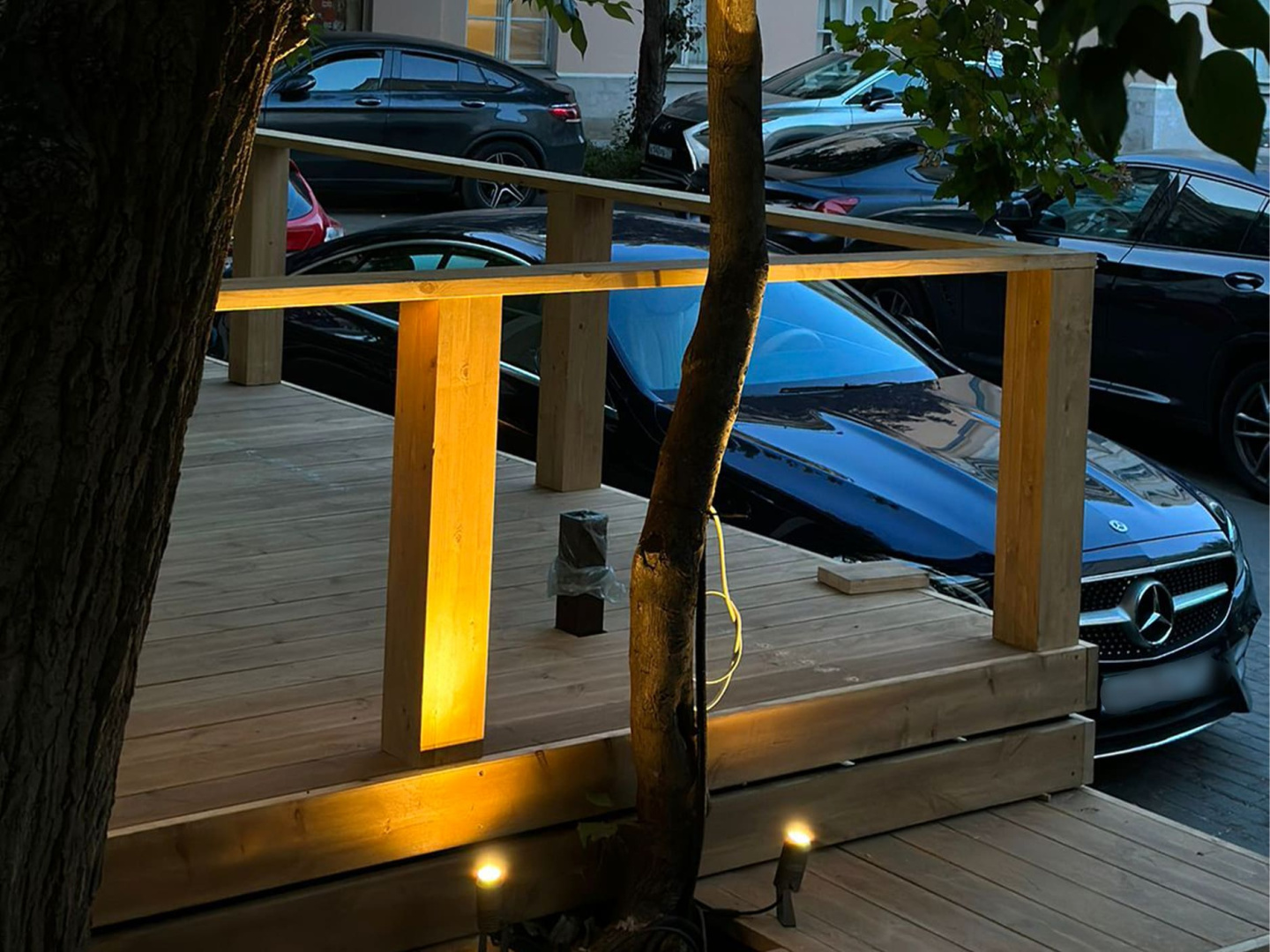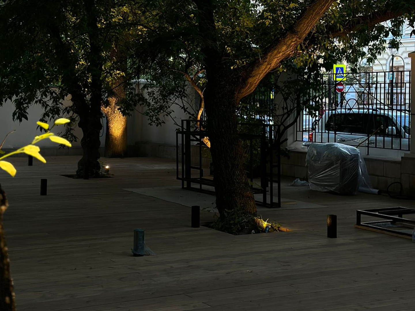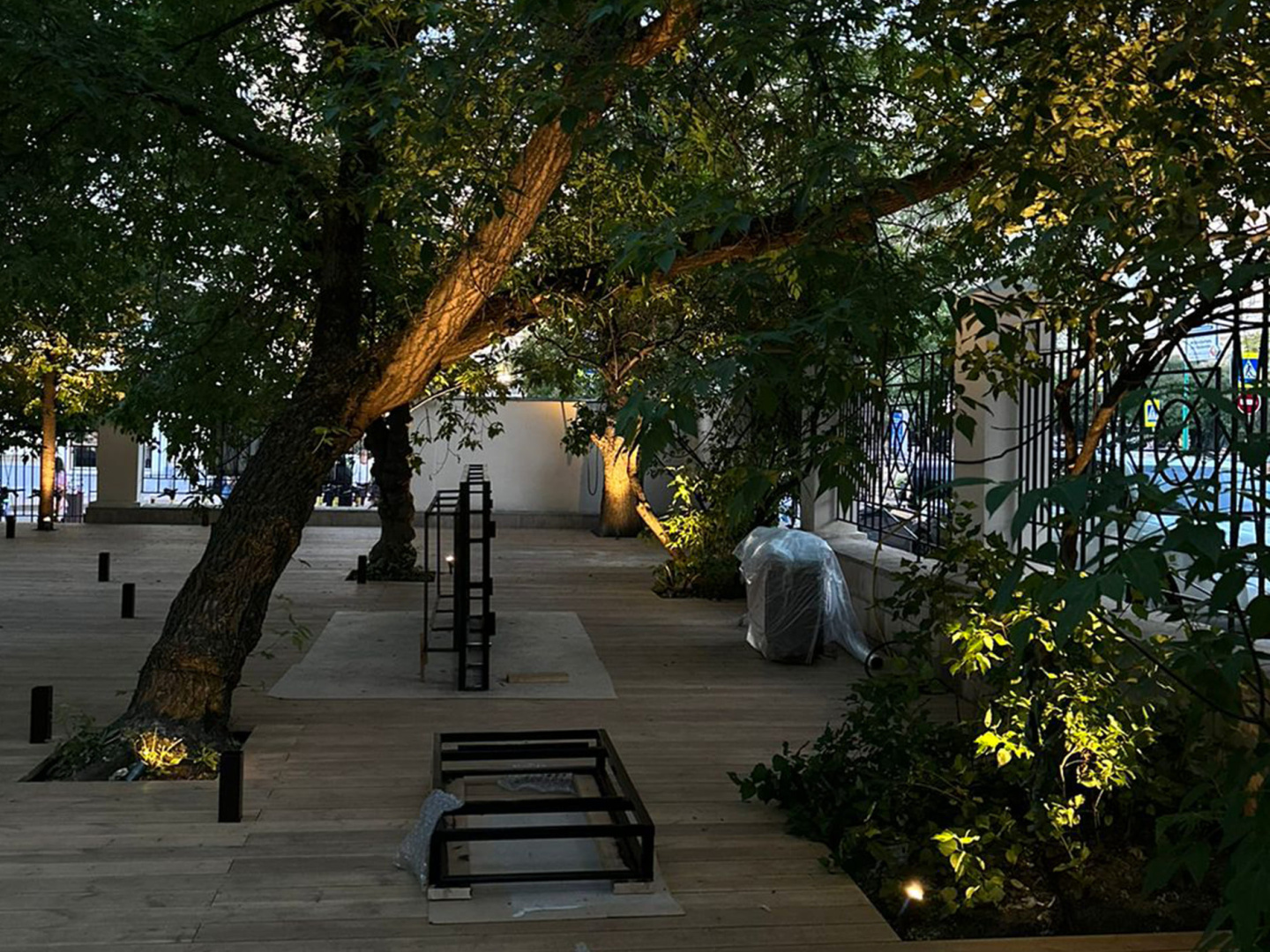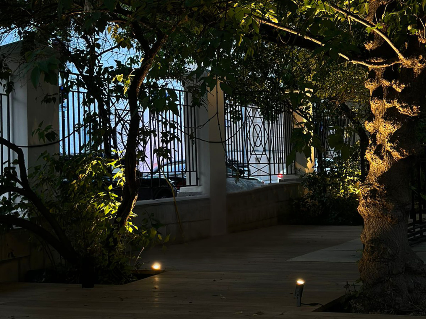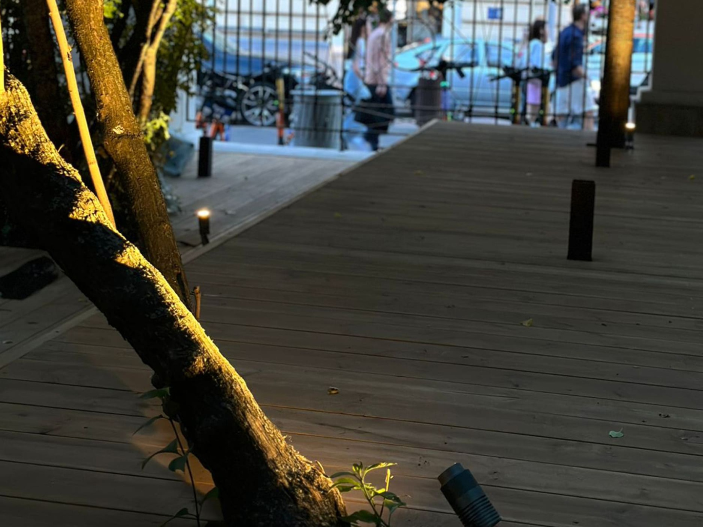 При помощи дополнительных аксессуаров (основания-пики или круглого основания) прожекторы установлены в грунт и на поверхность досок. Всего использовано 20 светильников.